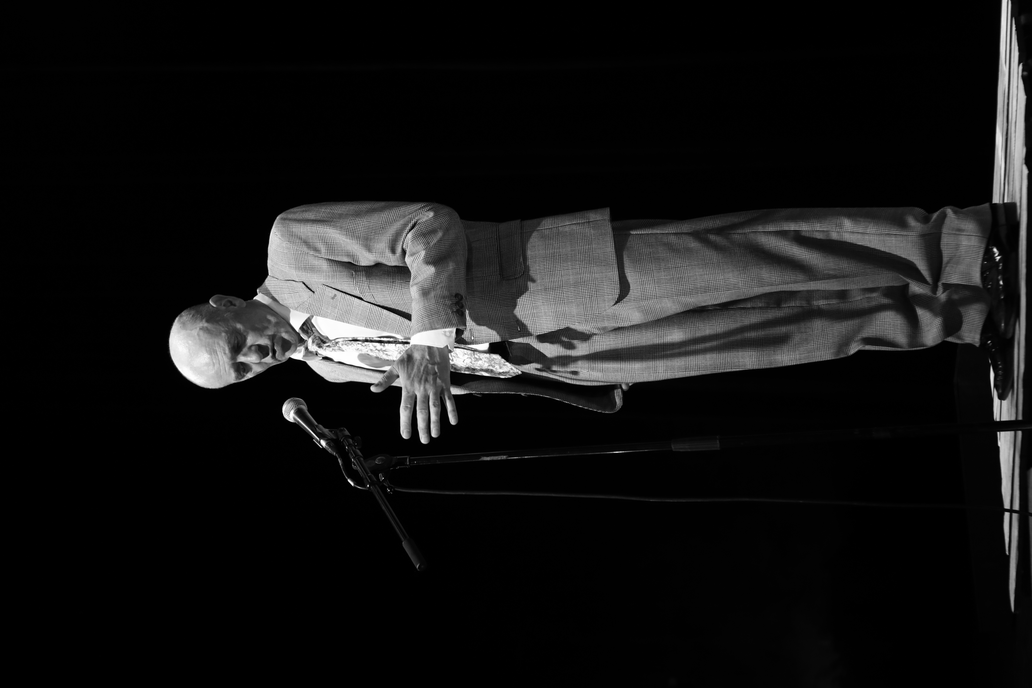 Saoulés de discours, de points de vue, d’opinions, saoulés de stratégies, défaits des petites phrases, des réactions, des sondages, rincés de toutes les prises de paroles et malgré tout on remet ça, L’Oral et hardi — soigner le mal par le mal ! Avec l’apostrophe ! La logorrhée comme dépuratif, sans retenue. Administrer l’allocution poétique l’Oral et Hardi dans tous les théâtres, en plusieurs doses et sous l’assistance respiratoire de Jean-Pierre Verheggen, monument, maître phénoménal de l’assonance et du jeu de mots, vrai-faux charlatan de la poésie : Embarquez-vous pour ne plus vous taire, hurle Verheggen dans les tourmentes. C’était d’un autre temps déjà, hérité des hyperboles contestataires situationnistes, et cette démesure-là nous rassure. L’excès ne nuit pas toujours.